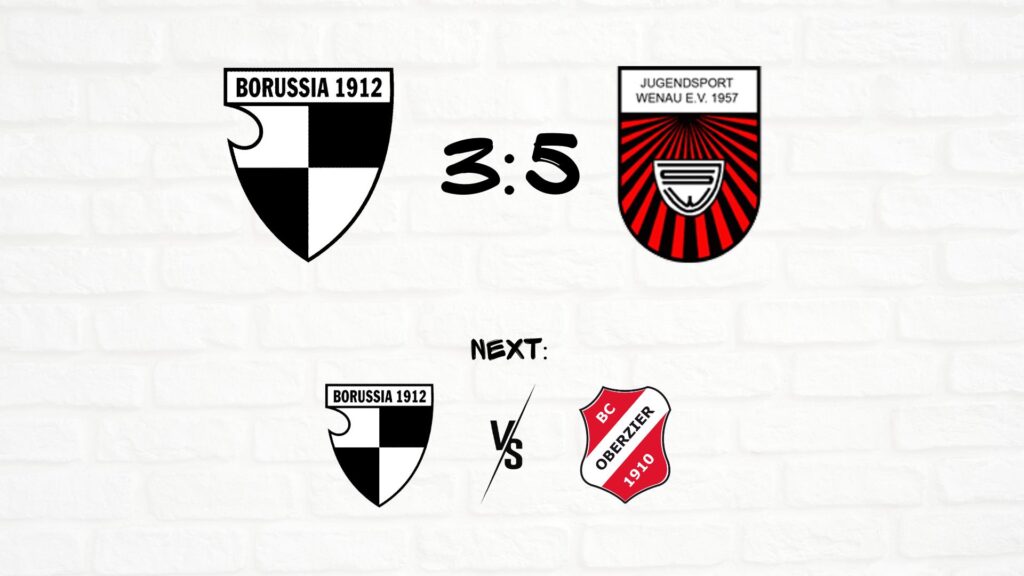 Die Partie begann alles andere als nach Wunsch für die Borussen. Bereits nach neun Minuten lag das Team von Trainer Chris Reimer mit 0:2 zurück, begünstigt durch zwei individuelle Fehler, die Wenau konsequent ausnutzte. Doch die Platzherren zeigten eine starke Reaktion, fanden zunehmend besser ins Spiel und erarbeiteten sich eigene Torchancen. Der verdiente Lohn folgte mit dem Ausgleich, nachdem die Borussia sich auch mental stabil präsentierte. In der Folge boten sich sogar hochkarätige Möglichkeiten zur Führung, die jedoch ungenutzt blieben. Stattdessen gerieten die Gastgeber noch vor der Pause erneut in Rückstand, als ein Freistoß samt Nachschuss zum 2:3 verwertet wurde.